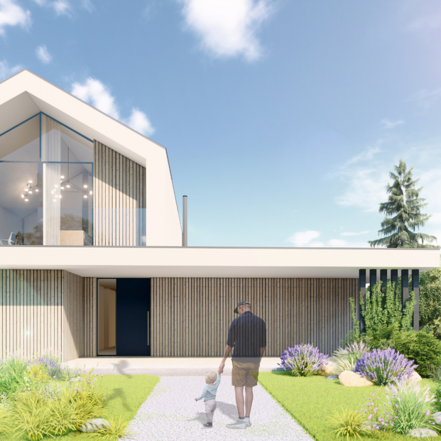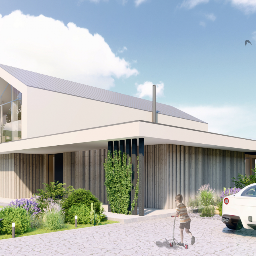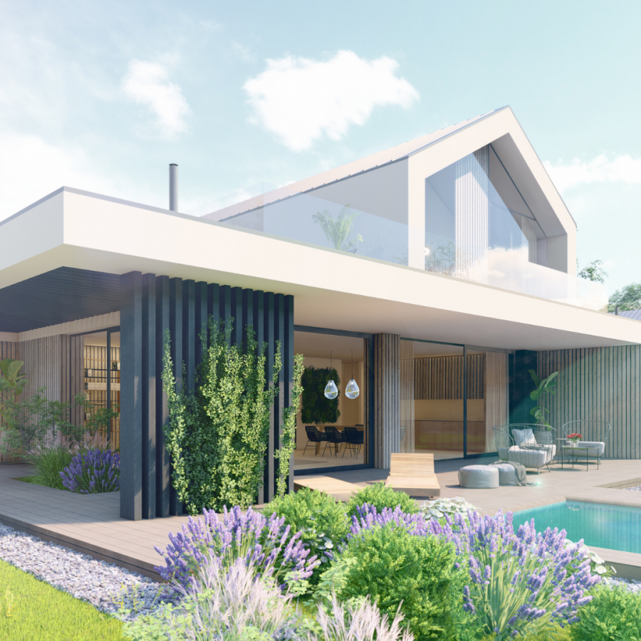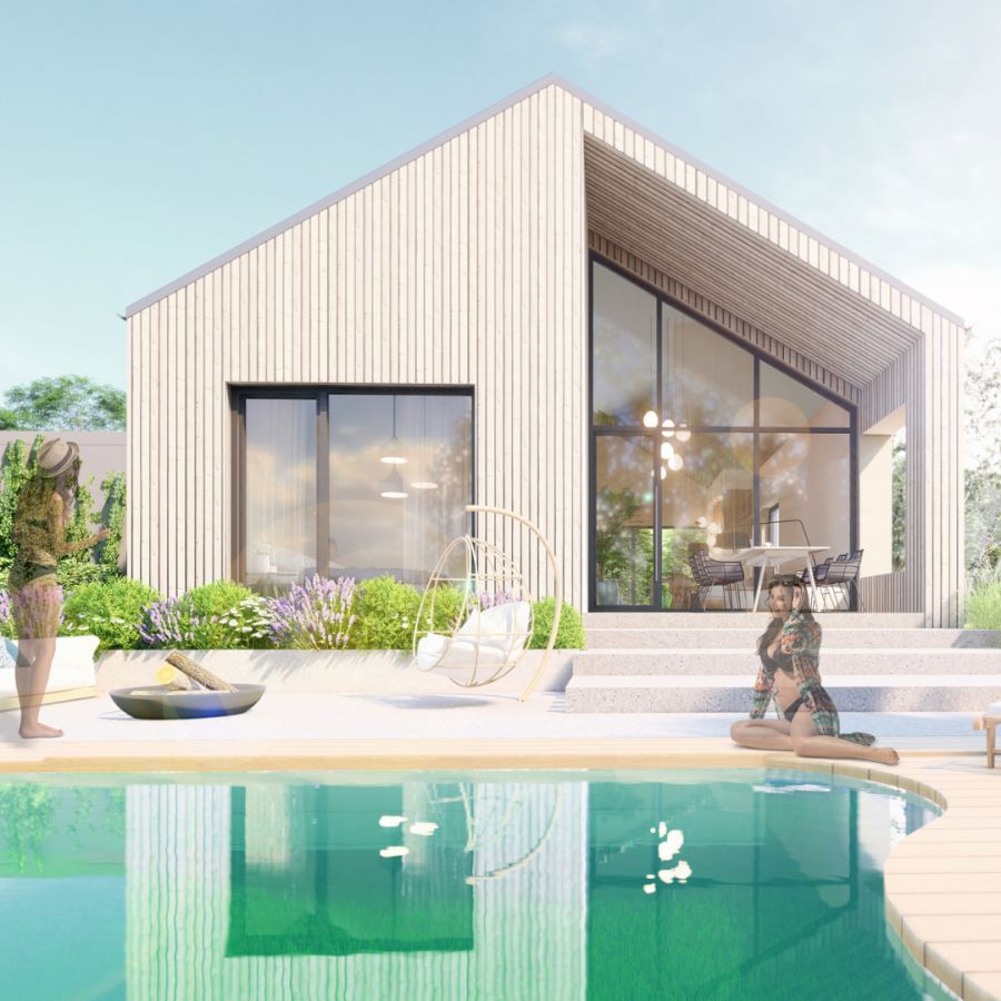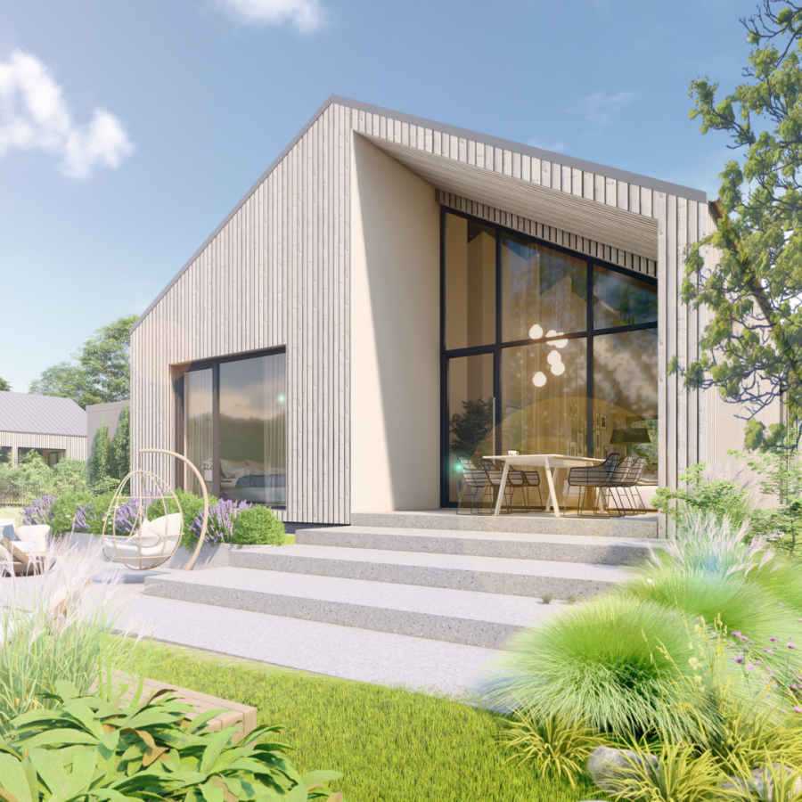 Das einstöckige Haus mit einer Nutzfläche von 102 bis 135 m2 und einer Terrasse bietet eine perfekte Kombination aus Architektur und modernem Design, dominiert von Holzelementen und einer Glaswand. Für zukünftige Besitzer bietet es die perfekte Kombination aus Luxus und Privatsphäre inmitten der malerischen Natur.